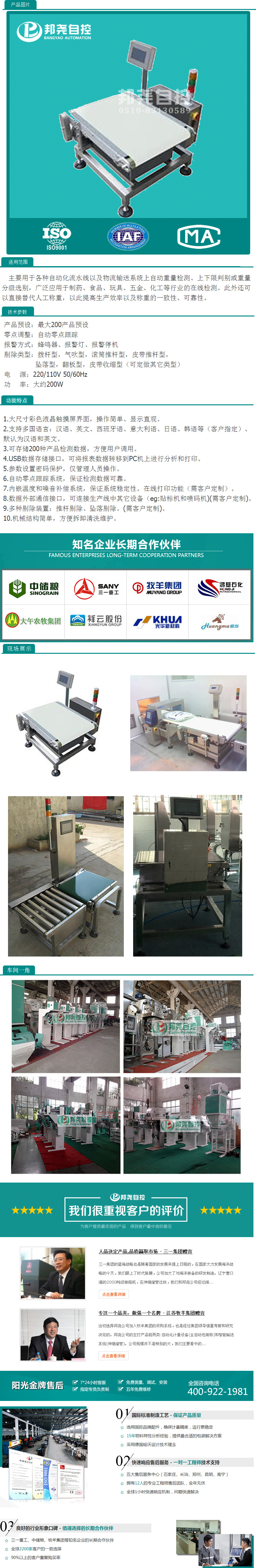 重量選別機又叫重量分選機,在線檢重秤,是一種應用于各種自動化流水線以及物流輸送系統(tǒng)上的自動重量檢測、上下限判別或根據(jù)重量檢測產(chǎn)品是否合格的高科技自動化分選設備。廣泛應用于制藥、食品、玩具、五金、化工、汽車配件等行業(yè)的在線檢測。此外,還可直接替代人工稱重,以達到提高生產(chǎn)效率,提高準確度和山少人工,降低成本的目的。